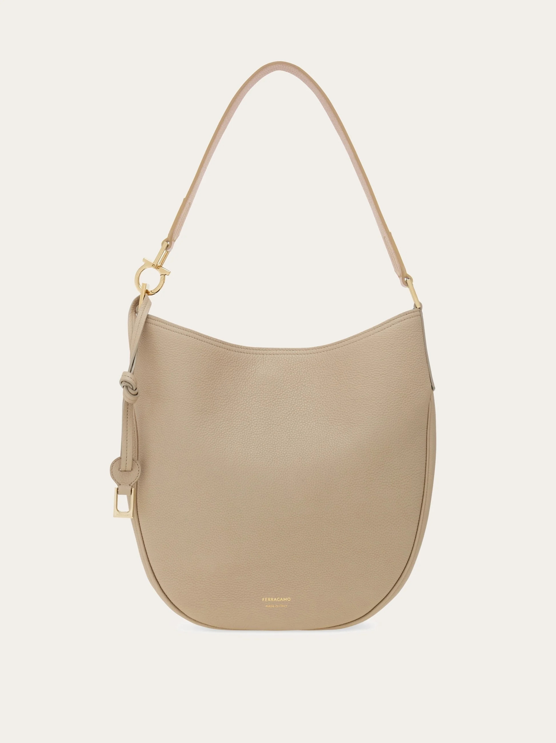 Clean lines and iconic accents characterize the new Ferragamo Hobo bag. This medium iteration in hammered calfskin lays softly against the body. It opens via a metallic zip to reveal a canvas-lined interior. Attach the leather string with golden charm to extend the custom jacquard shoulder strap. - A) Height 10.8 IN B) Length 12.0 IN C) Width 3.5 IN - Composition: hammered calfskin - Handle drop: 10.2 in/26 cm - Medium - Made in ITALY - Product code: 21A170 785032