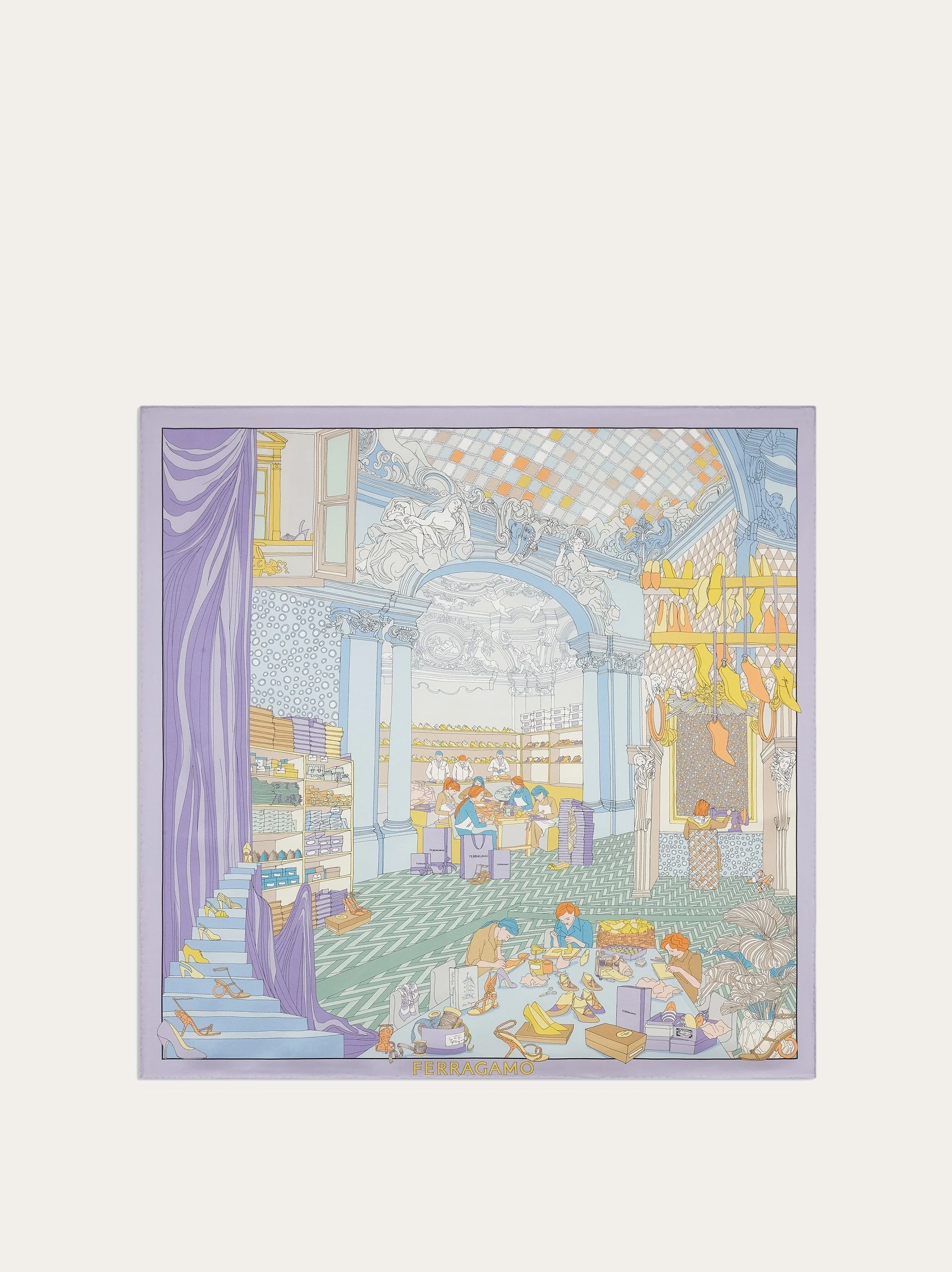 Part of a graphic narrative that began a few seasons ago, this scarf features a multicolor print inspired by the Ferragamo world. Like a Renaissance painting, the scene is depicted with a wealth of detail: brand symbols, the shapes of Marilyn Monroe's shoes and the contrast between archival and new packaging are just some of the elements that make it a true tableau vivant to be explored at leisure. - length 35.4 IN width 35.4 IN - Composition: 100% silk - Made in ITALY - Product code: 310174 776444