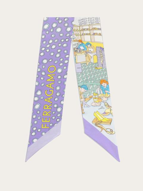 Part of a graphic narrative that began a few seasons ago, this scarf features a multicolor print inspired by the Ferragamo world. Like a Renaissance painting, the scene is depicted with a wealth of detail: brand symbols, the shapes of Marilyn Monroe's shoes and the contrast between archival and new packaging are just some of the elements that make it a true tableau vivant to be explored at leisure. - length 35.4 IN width 35.4 IN - Composition: 100% silk - Made in ITALY - Product code: 310174 776443