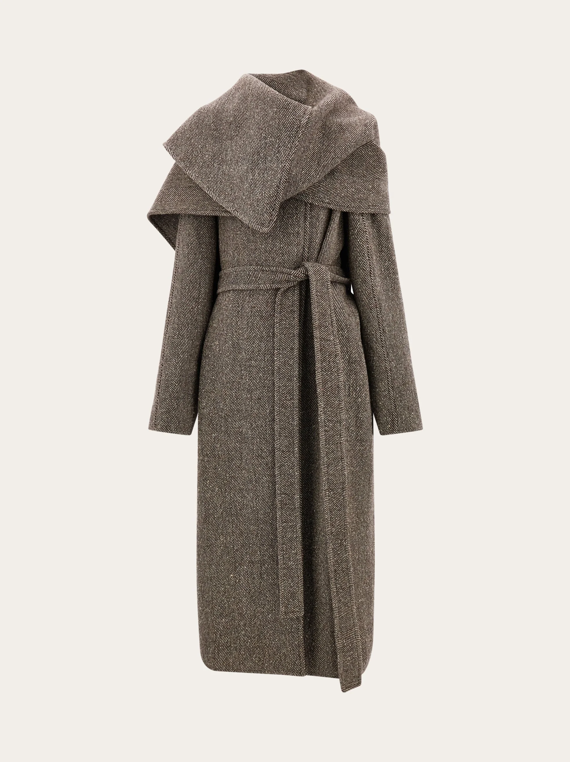 The expansive silhouette and soft, structured chevron fabric enhance the stage presence of this oversized longline coat. The elegant drape of the cape-like collar introduces a dramatic element, while the volume is cinched at the waist with a tonal belt. Kimono sleeves complete the design. - Composition: 83% pure virgin wool, 17% cotton - Made in ITALY - Product code: 13H559 788141