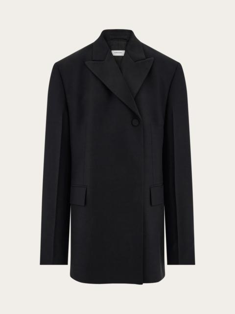 Inspired by the personal wardrobe of renowned choreographer Pina Bausch, the oversize cut of this double breasted blazer balances comfort and freedom of movement with impeccable tailoring. The pure virgin wool chevron stretch fabric softly hugs the body and draws a vertical line across the bust and sleeves, with the signature pressed pleat. Diagonal buttonholes add an original touch. - Composition: 92% pure virgin wool, 6% polyamide, 2% elastane - Made in ITALY - Product code: 13H555 788043