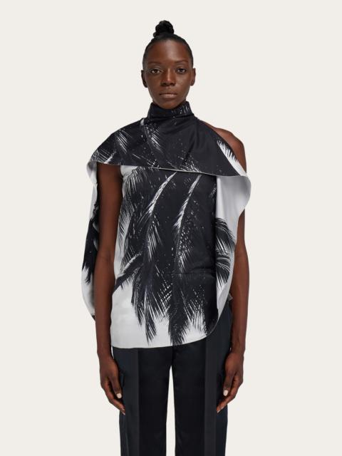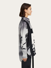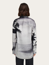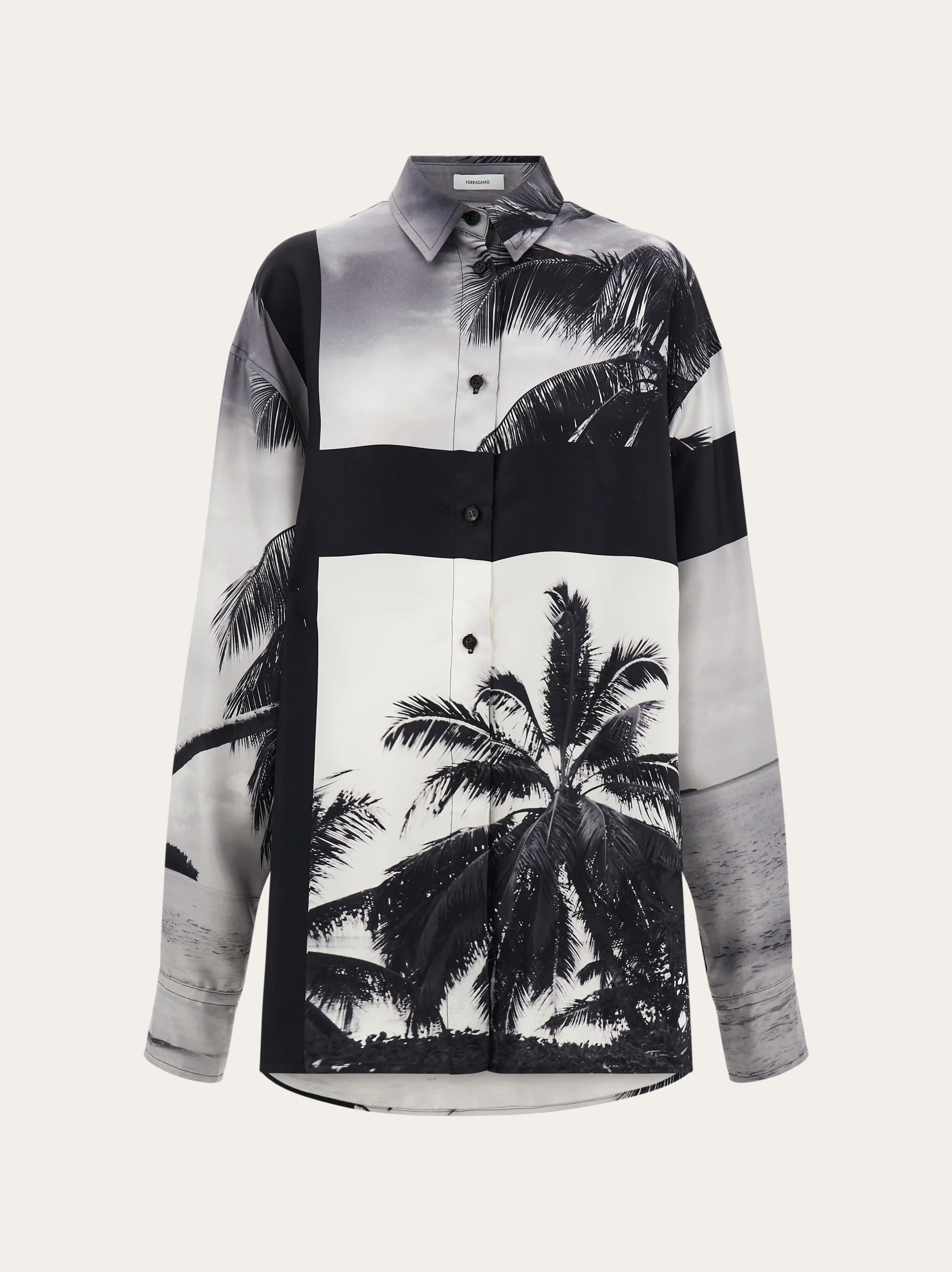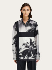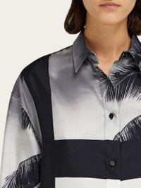 Clean lines and oversize volumes characterize this silk shirt featuring the new Trinidad print. The all-over pattern evokes the unexpected charm of old postcards, in black and white for a graphic effect. The asymmetrical bottom with visible stitching and side slits complete the design. - Composition: 100% silk - Made in ITALY - Product code: 13H789 788606