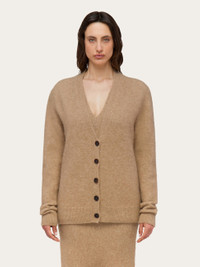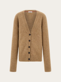 Masculine inspired cashmere blend cardigan with a touch of silk and alpaca wool for a rich, luxurious feel. Ideal for the colder weather, it features a V-neck with custom buttons and rib trims. The contrasting red stitching inside the wrists echoes the attention to detail that characterizes the Ferragamo workmanship belied by the simple silhouette. - Composition: 42% alpaca, 27% silk, 19% cashmere, 9% polyamide, 3% elastane - Made in ITALY - Product code: 112892 777622