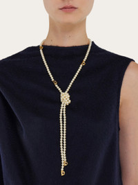 Long necklace strung with glass pearls and a central knot for a graceful drop effect. Naturally elegant, it shimmers with a glamorous touch thanks to inserted Gancini silhouettes—an interplay of light and golden reflections. - Composition: brass and crystals - Made in ITALY - Product code: 760930 790668