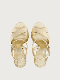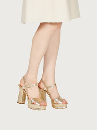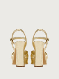 The undisputed star of the dancefloor, not to mention cocktail hour, this glam, chunky sandal in a platinum finish is both flattering and stable thanks to the wide heel and toe wedge, whose indent adds an artistic flair in an attention to detail for which Ferragamo is known and loved around the world. The Gancio features both on the clasp and at the back of the ankle strap for a discreet nod to its creator. - Heel 11,5 cm - Composition: laminated calf leather - Made In ITALY