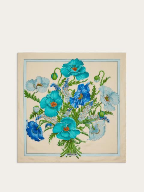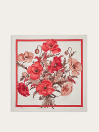 Feminine and boldly colored, this pure silk foulard is adorned by a lush poppy print, flowers that are near and dear to Salvatore Ferragamo and associated with the idea of freedom and adaptability. This print portrays them as a bouquet, with refined details and bright hues. As with all the other styles, the trim is hand-sewn. - length 35.4 IN width 35.4 IN - Composition: 100% silk - Made in ITALY - Product code: 310158 771387