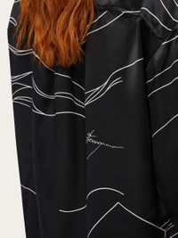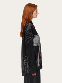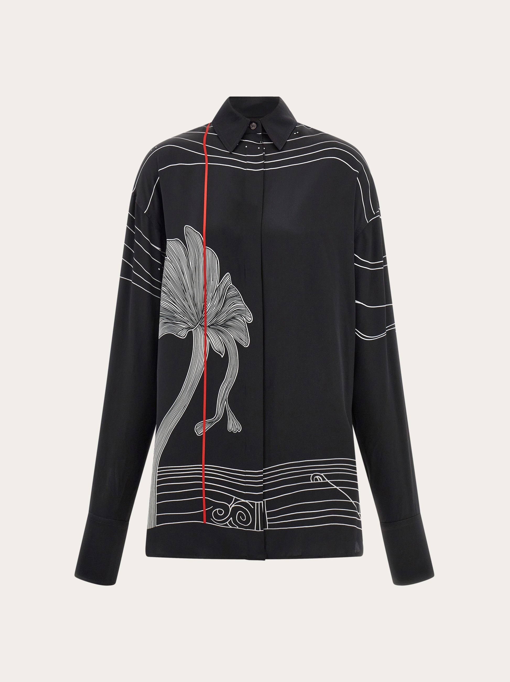 The uncanny dreamlike motif depicted on this satin dress is called Spirit, a design that runs throughout this season’s collection. The vertical red line that runs through it echoes a current appeal whose minimal construction includes an oversized fit with drop shoulder, covered placket and asymmetrical hem. Worn open it reveals a coordinated printed inside. - Composition: 100% silk - Made in ITALY - Product code: 13G298 778030
