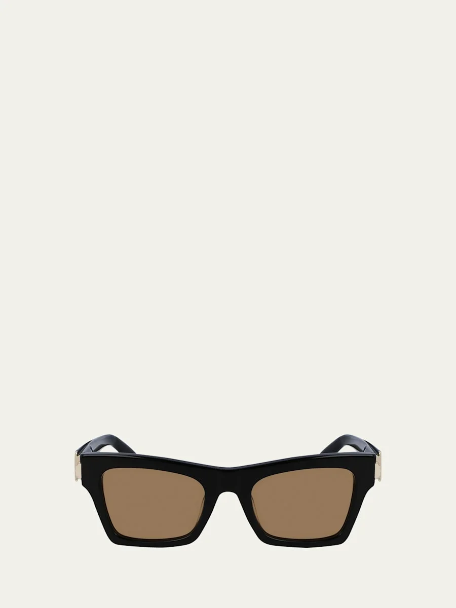 Ferragamo "Prisma" cat-eye sunglasses in acetate Lens/bridge/temple (in mm): 52-21-135 Solid-color lenses Saddle nose bridge Logo on temples Thin, tapered arms Wipe clean 100% UVA/UVB protection Made in Italy Proposition 65 warning for California residents Online Inquiries: BGS21_D4XE9| Store Inquiries: #4794419