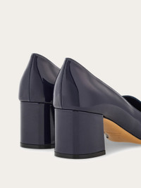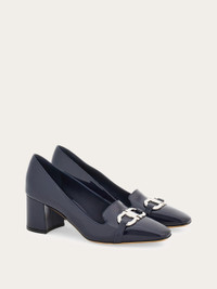 Uptown girl. A new twist on the iconic Ferragamo loafer, the vamp on this block heeled slip on is inspired by the classic silhouette. Made of the softest patent, it has a Gancio buckle on the instep, held by a custom square tab in the center. The large covered heel ensures all day comfort for strutting the runway of life. - Composition: patent calfskin - Made in ITALY - Product code: 01F929 776839