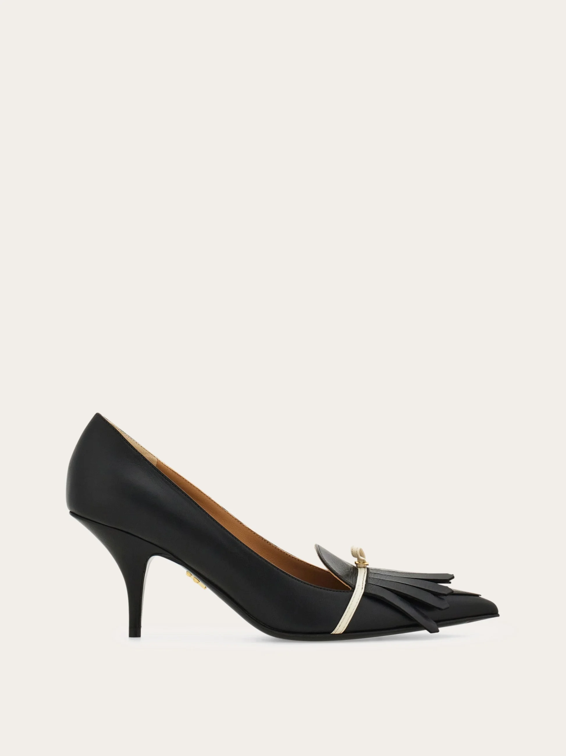 Cut from the softest kid leather, this new Ferragamo pump is the perfect blend of uptown chic and effortless femininity. The slim mini bow cuts across the tip where a loafer inspired fringe detail adds a preppy twist. The curved heel is the ideal height for all day comfort. - Composition: kid leather - Made in ITALY - Product code: 01K923 790504