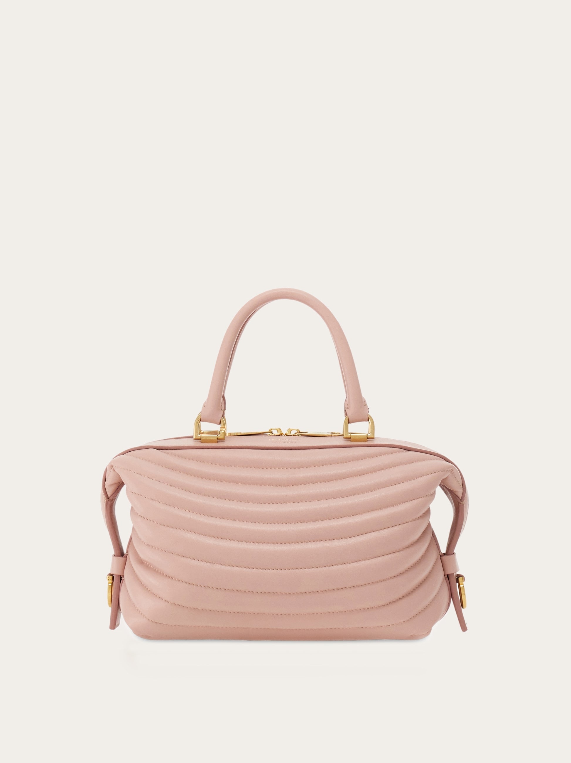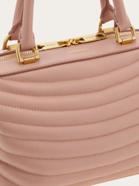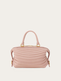 Impossible to resist. The quilted ripples on this new Ferragamo bowling bag are inspired by the iconic Rainbow shoe, designed by Salvatore Ferragamo for Judy Garland in 1938. With a golden logo in between the golden rings that hold the top handle, this contemporary accessory zips open to reveal a lined, roomy interior with zip pocket. Removable shoulder strap for hands free style. - height 6.4 IN length 10.2 IN width 6.2 IN - Composition: calfskin - Made in ITALY - Product code: 219477 776660