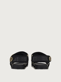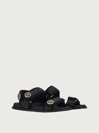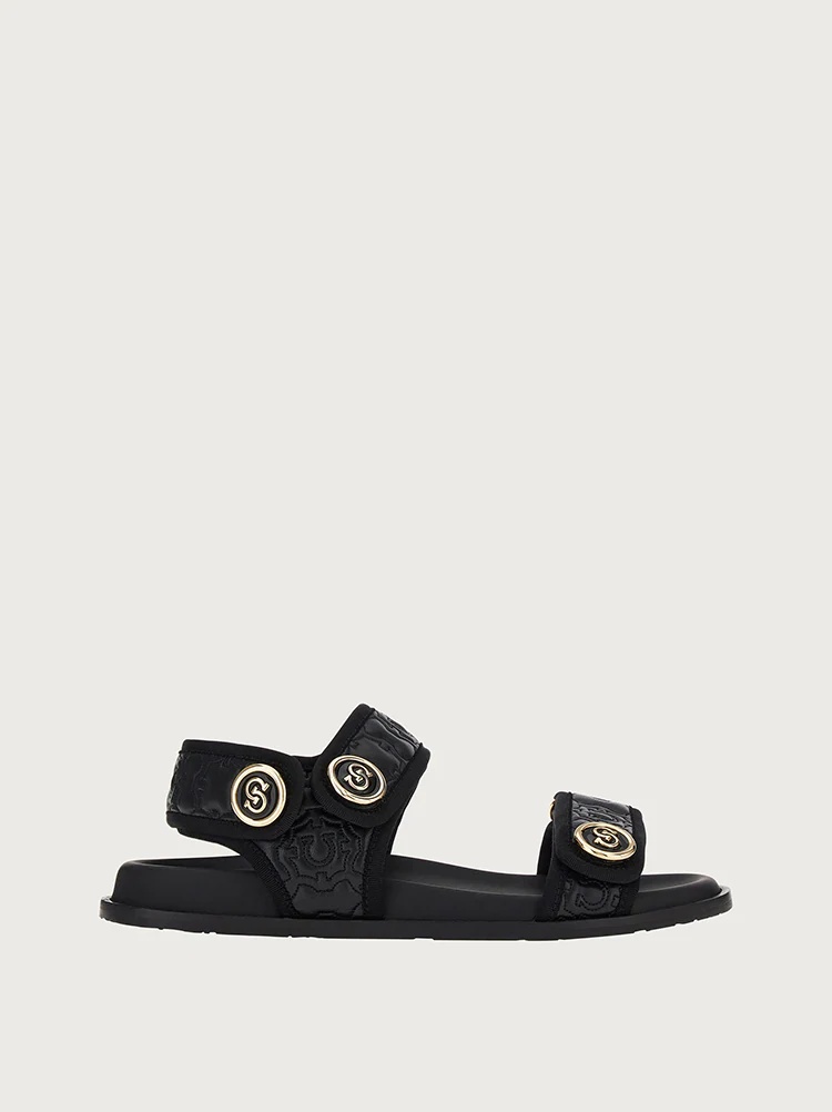 Striking winter sandals with a super trendy flair. The calf leather upper has a quilting effect embossed with the Gancini Galore pattern, a distinctive motif of the House of Ferragamo. The straps across the toes and at the heel ensure a personalized fit, while the golden metallic buttons with the Gancio S symbol complete the design. - Heel 3 cm - Composition: calf leather - Made In ITALY