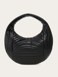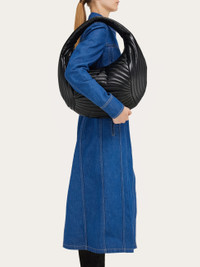 Precise but never precious, the Ferragamo Hobo is the symbol of contemporary femininity. Made of smooth calfskin, with a soft, rippled padding that echoes the Rainbow shoe created by Salvatore Ferragamo for Judy Garland in 1938. This capacious version has a soft, rounded silhouette with a perfectly organized interior with contrasting lining that opens via a two-way zip. - height 17.3 IN length 18.8 IN width 7.4 IN - Composition: calfskin - Made in ITALY - Product code: 218936 776493