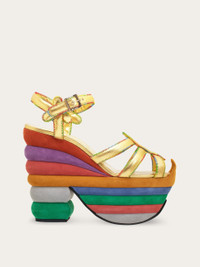 The Rainbow sandal, a timeless creation by Salvatore Ferragamo that transcends fashion eras, was crafted in 1938 for Judy Garland. The sandal boasts a cork heel and wedge, harmoniously lined with the rainbow colored suede, showcasing Ferragamo's unmatched creative genius in seamlessly blending forms and colors. This model stands as one of the most renowned pieces of the shoemaker of the stars. - Composition: nappa and suede - Made in ITALY - Product code: 01I095 772433