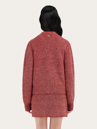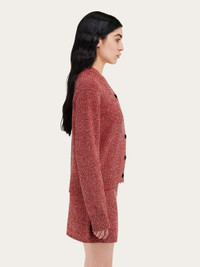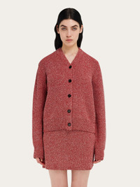 Precious threads and unexpected textures bring the new collection to life: cotton and viscose blend cardigan with a refined two-tone texture. The fit is soft and boxy, with a slightly dropped shoulder, small V-neck and ribbed trims. Custom buttons fasten along the front and a metal tab featuring the FERRAGAMO lettering is placed at the back of the neck. Pair with the matching top and miniskirt for the full impact. - Composition: 53% cotton, 20% viscose, 18% polyamide, 8% polyester 1% other fibers - Model measurements: Height 5' 10"/178 cm cm; Bust 30½"/78 cm; Waist 23"/59 cm; Hips 35"/89 cm - Model wearing: XS - Made in ITALY - Product code: 112988 781005