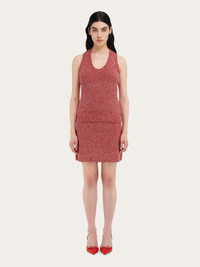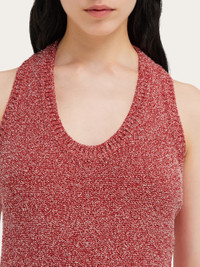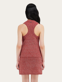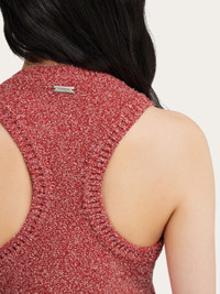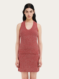 The soft side of the new collection: cotton and viscose boucle tank with a refined, two-tone texture. The slim fit features a rounded V-neck, and racer back, with ribbed trims, and a custom metal tab at the back of the neck. Pair with the matching skirt and cardigan for the full impact. - Composition: 53% cotton, 20% viscose, 18% polyamide, 8% polyester 1% other fibers - Model measurements: Height 5' 10"/178 cm cm; Bust 30½"/78 cm; Waist 23"/59 cm; Hips 35"/89 cm - Model wearing: XS - Made in ITALY - Product code: 113187 781003