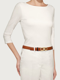 Feminine and versatile, this slim belt has been crafted from supple, natural grained calfskin leather and features a gold-tone Gancini buckle for a touch of effortless elegance. The slender design will work with crisp tailoring and casual attires alike. The adjustable length allows for a more personalized fit and style. We invite you to check our size guide for more information. - height 0.9 IN - Composition: calfskin - Made in ITALY - Product code: 23A565 674487