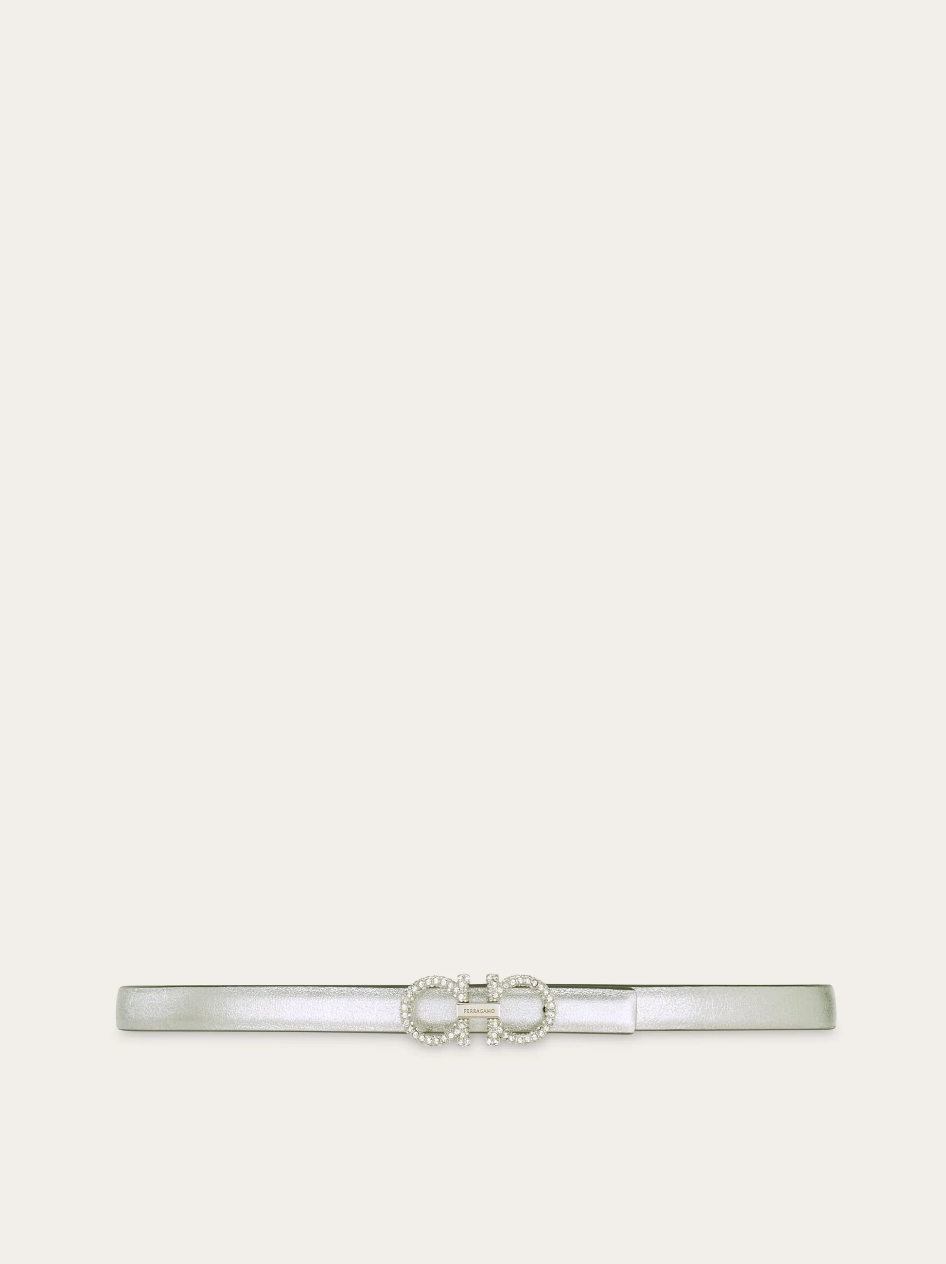 Add a touch of glamour to everyday looks with this reversible belt, featuring metallic silver calfskin on one side and classic black on the other. The iconic Gancini buckle sparkles with a pave of micro-crystals, while its sleek 2 cm width enhances its feminine appeal. - height 0.5 IN - Composition: laminated calfskin - Made in ITALY - Product code: 230435 786368