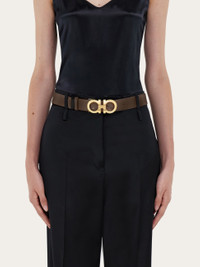 With its streamlined silhouette and signature details, this belt is a timeless wardrobe staple. The sophisticated two-tone design is crafted from calfskin leather and adorned with the unmissable Gancini buckle – rendered here in a gold hue. The adjustable length allows for a more personalized fit and style. We invite you to check our size guide for more information. - height 1.3 IN - Composition: calfskin - Reversible and adjustable belt with removable buckle - Made in ITALY - Product code: 23A564 790100