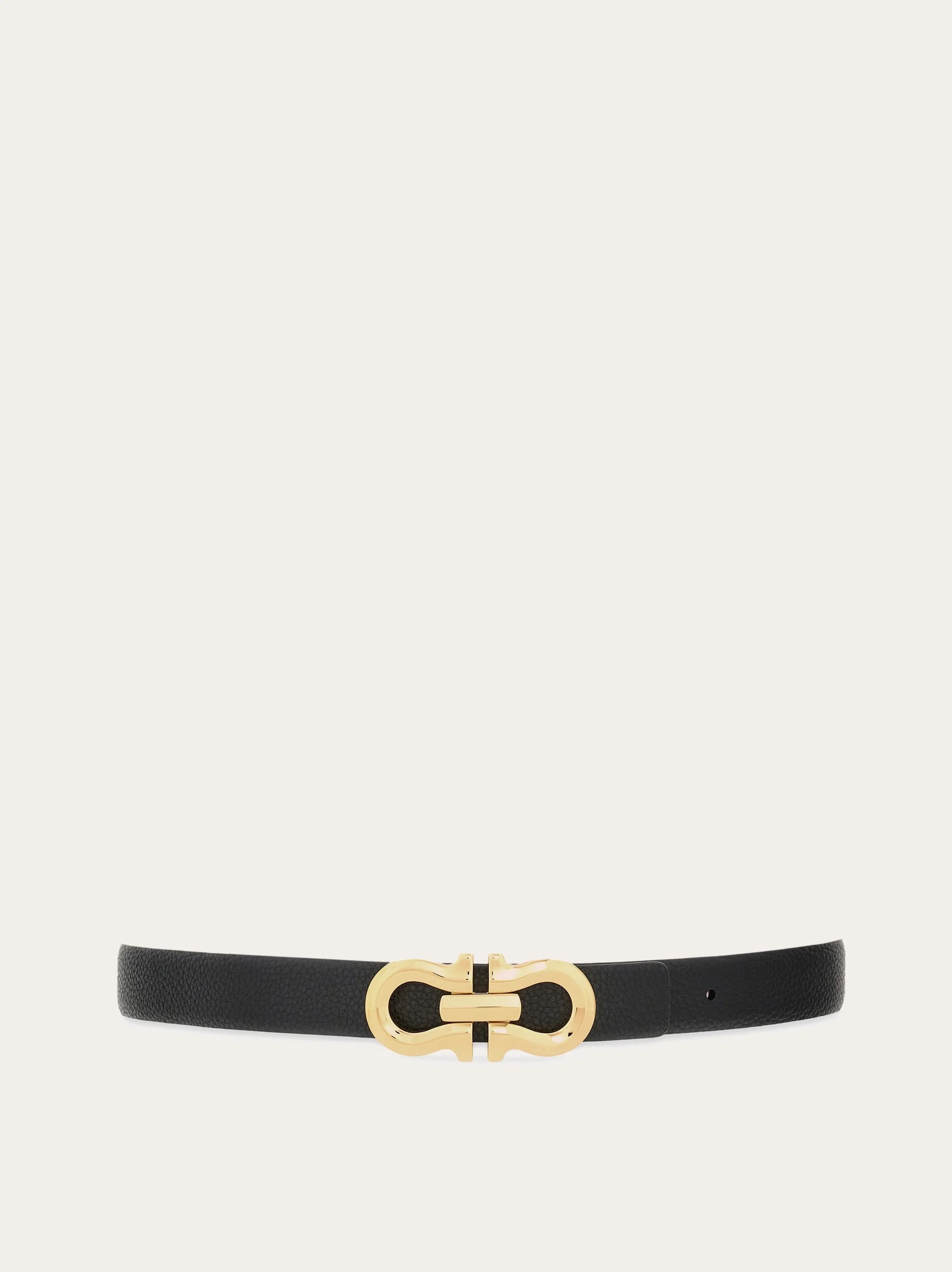 Metropolitan flair and golden touches define this new Ferragamo belt. Crafted from hammered calf leather, it features a reversible two-tone construction that allows for multiple styling options. The stylized Gancini silhouette buckle adds a touch of elegance to the design. - height 0.9 IN - Composition: hammered calfskin - Made in ITALY - Product code: 230329 775596