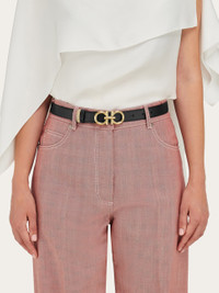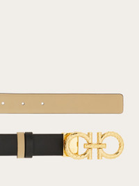 Versatile ladies belt made of soft calfskin leather. The two tone shaft is reversible and adjustable in length, and features a golden Gancini buckle with a snake-like texture. The look is high end, completed by a two tone belt loop. The adjustable length allows for a more personalized fit and style. We invite you to check our size guide for more information. - height 0.9 IN - Composition: calfskin - Made in ITALY - Product code: 230359 780425