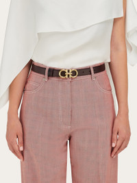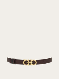 Versatile ladies belt made of soft calfskin leather. The two tone shaft is reversible and adjustable in length, and features a golden Gancini buckle with a snake-like texture. The look is high end, completed by a two tone belt loop. The adjustable length allows for a more personalized fit and style. We invite you to check our size guide for more information. - height 0.9 IN - Composition: calfskin - Made in ITALY - Product code: 230359 780428