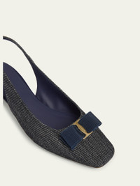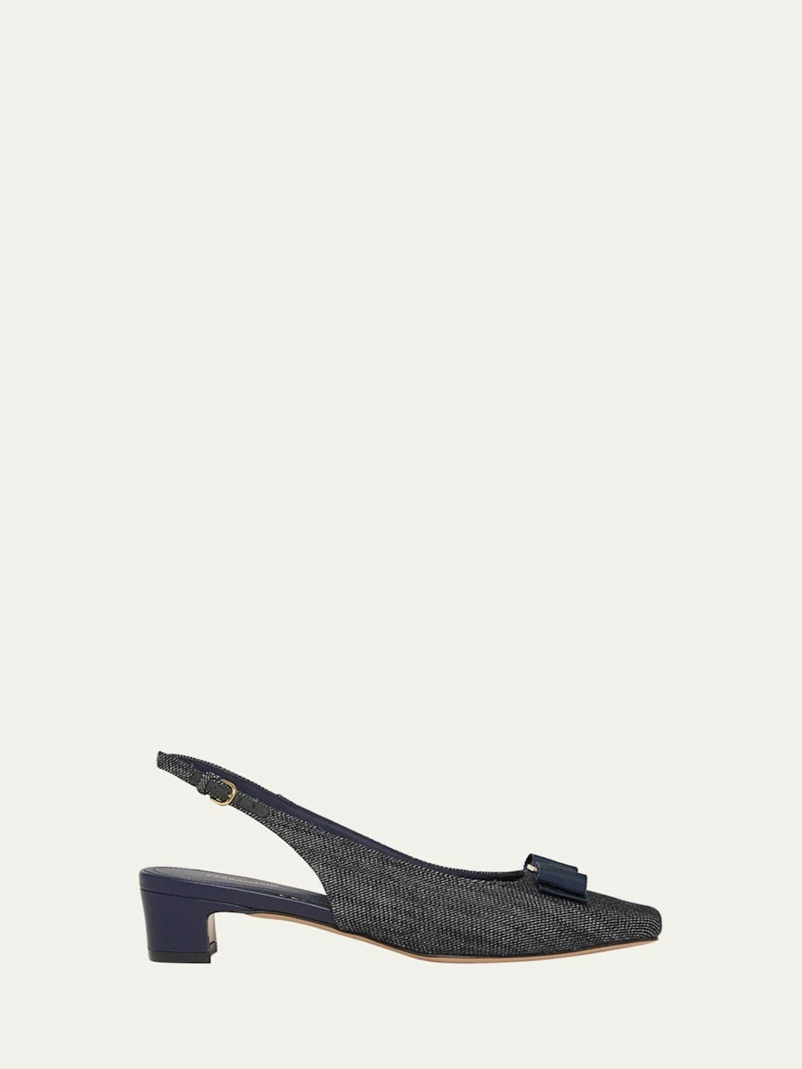 Ferragamo "Rivada" denim cotton pumps adorned with a logo-engraved bow accent 1.25 in / 30 mm block heel Square toe Adjustable slingback strap Leather outsole Lining: Leather Professional cleaning recommended Made in Italy Online Inquiries: BGS21_X6UT6| Store Inquiries: #4980298