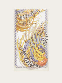 Feather-light and effortlessly elegant, this silk scarf brings any outfit to life. The Rooster print—a bold reworking of a heritage motif—unfolds in vibrant hues and painterly feathers, full of energy and movement. Finished with a graphic border in sharp contrast, it plays with dimension to striking effect. - length 62.9 IN width 17.7 IN - Composition: 100% silk - Made in ITALY - Product code: 321256 791389