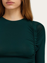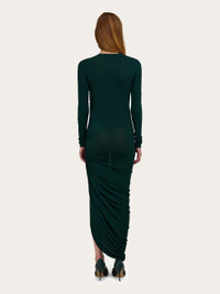 A clean cut silhouette with gathered details that follow and flatter the form. Stretch jersey brings to life this mid-length dress with ruched folds that run the entire length of the left side. The asymmetrical hem is complemented by a high slit and concealed zip on the right shoulder. - Composition: 78% viscose, 17% polyamide, 5% elastane - Model measurements: Height 5' 10"/178 cm; Bust 32 / 81cm; Waist 25"/63 cm; Hips 34½"/88 cm - Model wearing: 38/XS - Made in ITALY - Product code: 13H142 785370