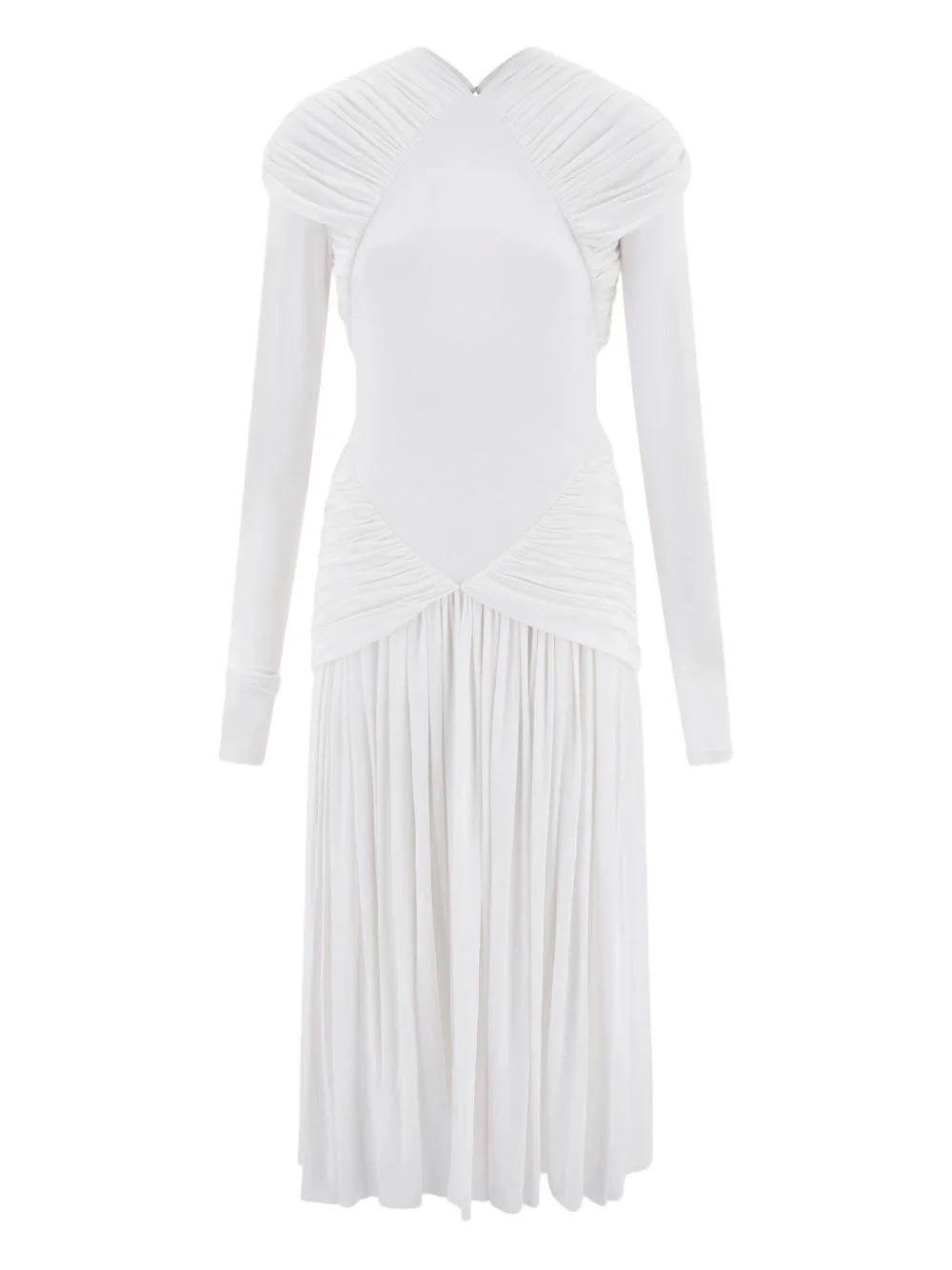 ruched long-sleeve dress Highlights - White - Gathered detailing - Long sleeves - V-neck - Concealed back zip fastening - Pleated skirt Made in Italy Composition Viscose 100% Washing instructions Read Manufacturer Guidelines