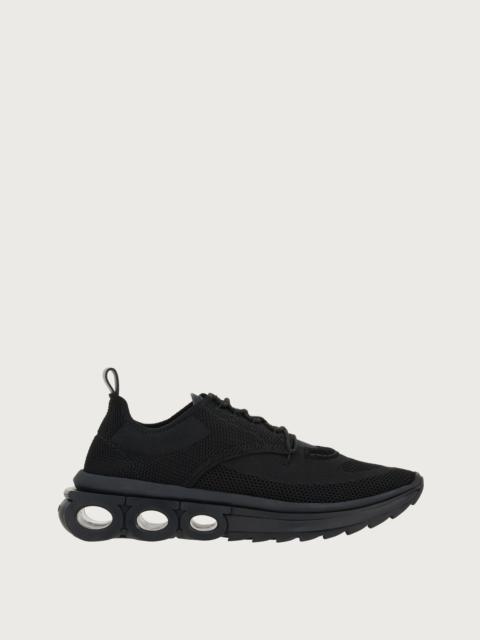 Technical knit sneakers with suede and nubuck details. The soft, second-skin-effect upper pairs with a bold sole featuring branded details and the Gancini silhouettes on the sides that create a filled/void effect. The knit of the upper is made using 100% recycled post-consumer polyester yarn, while the lining and back lining are made from leather tested and verified to have been produced using a chrome-free tanning process. Fussbett bandage lining instead is in leather tested and verified to have been produced using a metal-free tanning process, strobel felt is made using 20% recycled pre-consumer polyester fibres and sewing thread is made from 100% post-consumer recycled polyester. - Composition: polyester and calfskin - Product code: 030391 760870 - Made in ITALY
