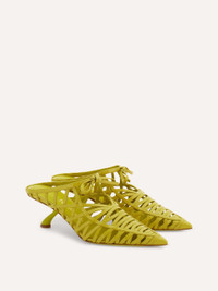 Maximilian Davis pays homage to the roaring twenties with this eclectic calfskin mule. The sculptural heel, originally designed by Salvatore Ferragamo himself, is brought to life with a contemporary aesthetic adding to the glamorous feel of this striking slip on whose straps are hand-applied by artisans. The pointed toe adds to her femme fatale charm. - Composition: calfskin - Made in ITALY - Product code: 01L752 792855