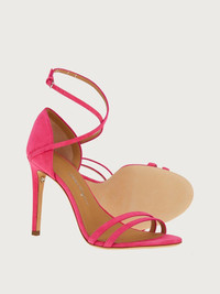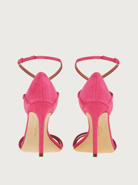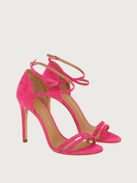 Sensual and simply stunning. This suede sandal is minimal chic at its very best. Two slim suede straps sit across the toe and one crossover strap buckles at the ankle. The naked foot effects suggests pairings with light dresses or skirts or even a silky trouser. The exciting bright colors will bring a bold touch to your outfit. Frankly the combinations are endless. The heel stands at a sexy 10.5cm and the leather sole has a Ferragamo signature. - Heel 10,5 cm - Composition: kid suede - Made In ITALY
