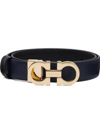 Reversible pebble-grained calfskin belt. Reverse in black pebble-grained calfskin. · Keeper loops at length · Logo hardware at post-stud fastening · Gold-tone hardware · W1" Supplier color: Mirto/Nero Calfskin. Made in Italy 251270F001003