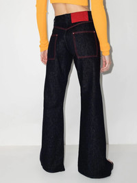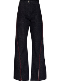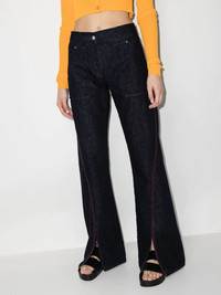 front-slit wide-leg jeans midnight blue cotton contrast stitching mid-rise belt loops front button and zip fastening two front patch pockets two rear patch pockets logo patch to the rear wide leg front slit Made in Italy Composition Cotton 100% SIZE & FIT Model measurements Height 5 ft 11 in(1.8 m) Bust/Chest 31.49 in(80 cm) Hips 36.22 in(92 cm) Waist 25.59 in(65 cm) FittingInformation This piece fits true to size. We recommend you get your regular size Cut for a loose fit Made with a mid-weight non-stretch fabric Washing instructions Hand Wash