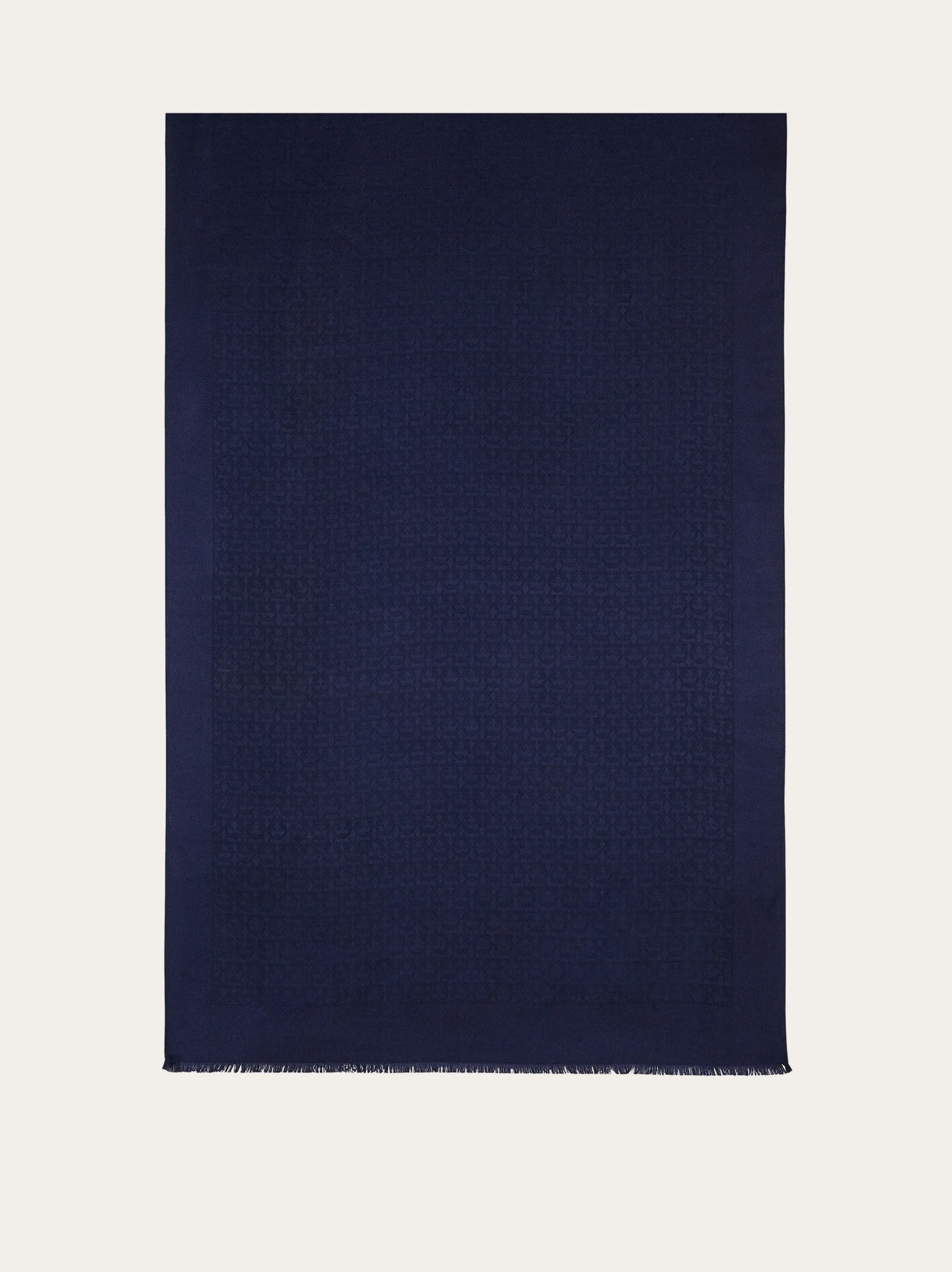 Light, soft and enveloping, this stole is the perfect complement for every moment of the day. The elegant jacquard woven Gancini pattern is finished off with a wide border with Ferragamo lettering. For refined styling with timeless style. - length 70.8 IN width 27.5 IN - Composition: 75% silk, 25% wool - Made in ITALY - Product code: 327987 725356