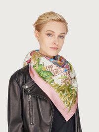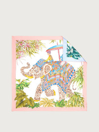 The elephant, made from an array of stylized flowers, lights up the center of this silk foulard. A revised pattern from the 90’s Ferragamo archives: the Maharaja rides on an elephant’s back as the elephant proudly trots through the sumptuous foliage that is used creatively around the border. The 29 different colors used to create the pattern are a testament to the Brand’s mastery in silk printing. - length 35.4 IN width 35.4 IN - Composition: 100% silk - Made in ITALY - Product code: 310118 756254