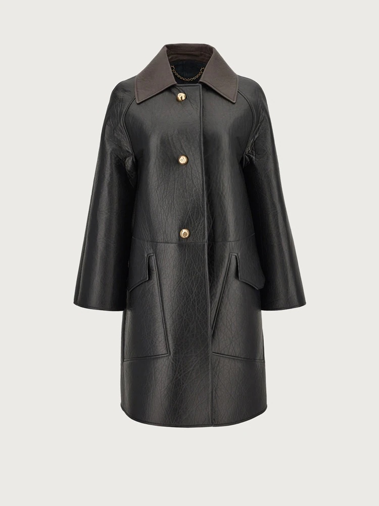 Cutting edge: this new nappa coat by Ferragamo takes classic pieces to new heights. The innovative combination of nappa leather and neoprene offers a glimpse at the fashion of the future. The flared line is emphasized by the raglan cut sleeves and diagonal patch pockets, while the wide, contrasting collar lights up the face. The golden Gancio buttons take up the details of the cage bag, in an extremely sophisticated play on aesthetic reference. Model measurements: Height 5' 10½ "/179 cm ; Bust 31½ "/80 cm; Waist 23½ "/60 cm; Hips 34½ "/87 cm - Composition: nappa and neoprene - Made In ITALY