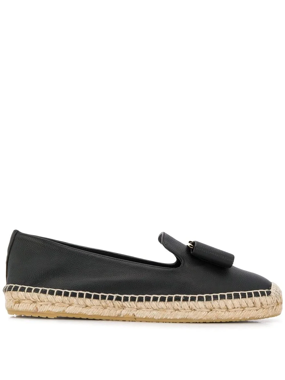 Sannio espadrilles Salvatore Ferragamo is renowned for its elegant and classic footwear, using rich and luxurious materials, the Florentine fashion pulls on their rich heritage to bring feminity and a modern inspiration to their signature staples. This black leather Sannio espadrilles from Salvatore Ferragamo features a round toe, a branded insole, flat woven sole with rubber base and signature engraved bow detail on the front. Imported Composition Sole: Rubber 100% Outer: Calf Leather 100% Lining: Calf Leather 100% SIZE & FIT Measurement Sole height 0.78 in(2 cm)