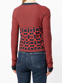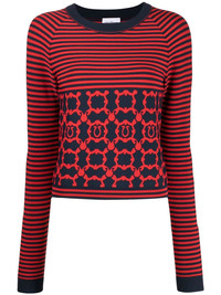 striped Gancini long-sleeve top red/navy Gancini print horizontal stripe pattern crew neck long sleeves straight hem Made in Italy Composition Body: Rayon 95%, Polyester 4%, Polyamide 1% SIZE & FIT Model measurements Height 5 ft 10 in(1.77 m) Bust/Chest 31.49 in(80 cm) Hips 34.64 in(88 cm) Waist 23.62 in(60 cm) FittingInformation This piece fits true to size. We recommend you get your regular size Cut for a loose fit Made with a mid-weight fabric Washing instructions Dry Clean Only