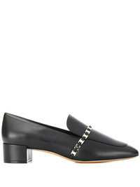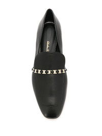 Tilos low heel pumps Black leather Silos pumps from Salvatore Ferragamo featuring a pointed toe, a slip-on style, a branded insole, a low heel, a gold-tone chain at the front and a low heel. Made in Italy Composition Outer: Calf Leather 100% Lining: Calf Leather 100% Sole: Calf Leather 100%