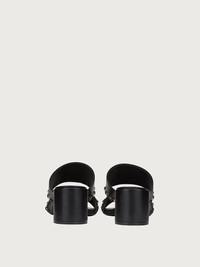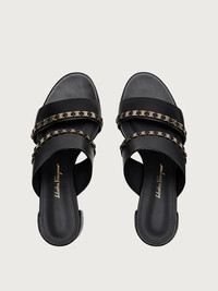 Slide your foot into this unmistakably Ferragamo sandal and enjoy the comfort of the chunky mid heel and wide straps. The straps are adorned with the iconic Vara in a golden chain, and the suede covered heel is an ideal 5.5cm in height. Minimal lines maximum style. - Heel 5.5cm - Composition: Nappa leather - Made In ITALY