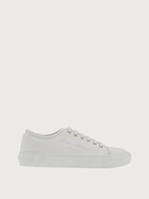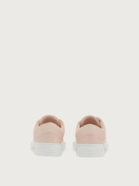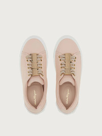 The perfect balance of a feminine sneaker with street style elements for an original look that is distinctively Ferragamo. This slip on sneaker is made of soft, Italian calf leather in a soft pink hue. The elastic laces feature a series of chunky buckles, inspired by the Vara bow. The thick, white sole features a series of raised Gancini around the edge and a personalized tread for Ferragamo style with excellent grip. - Heel 1 cm - Composition: calf leather - Made In ITALY