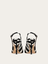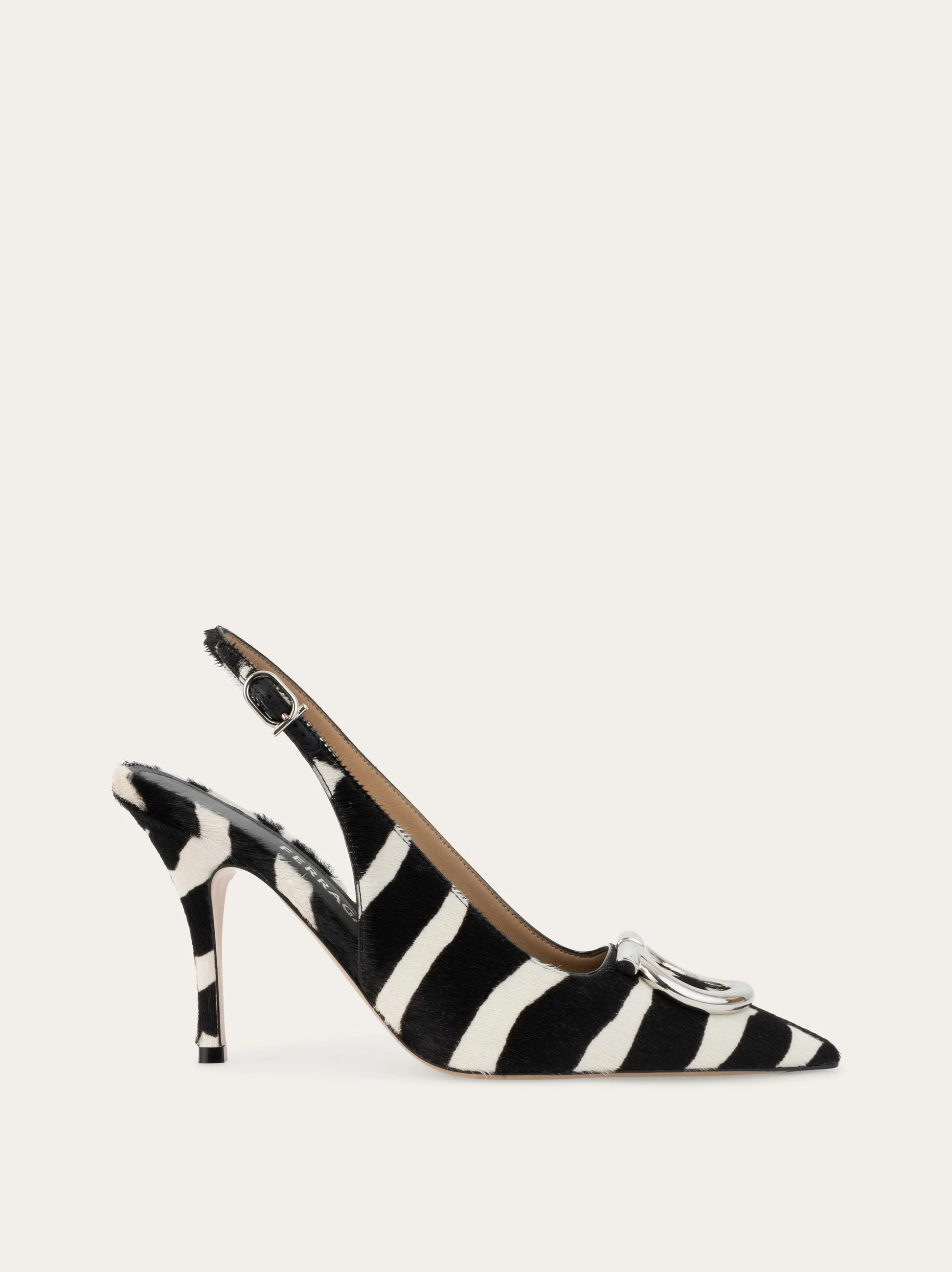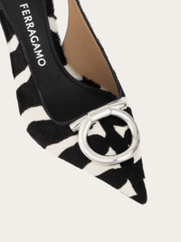 A bold take on the Ferragamo slingback, in soft pony skin with a cool zebra motif. The ultra feminine silhouette is adorned with a palladium tone Maxi Gancini at the tip. - Composition: pony skin - Made in ITALY - Product code: 01L262 790920