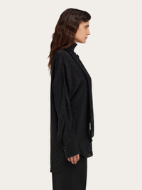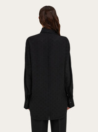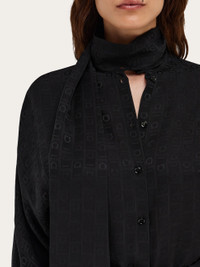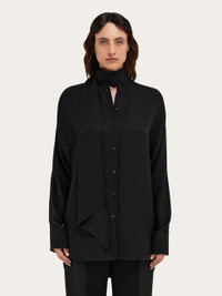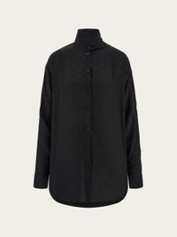 A much loved Ferragamo silhouette, revised in a contemporary key with iconic details. This pure silk shirt has kimono sleeves and button up cuffs. The fabric is covered with a tonal Ferragamo monogram all over, and its fluid feel is enhanced by a sash collar, that can be draped or tied as a scarf. The rounded bottom hem is longer at the back, creating an asymmetrical silhouette. - Composition: 100% silk - Model measurements: Height 5' 10"/178 cm; Bust 31½ "/80 cm; Waist 23½"/60 cm; Hips 34 "/88 cm - Model wearing: 38 - Made in ITALY - Product code: 13G530 780700