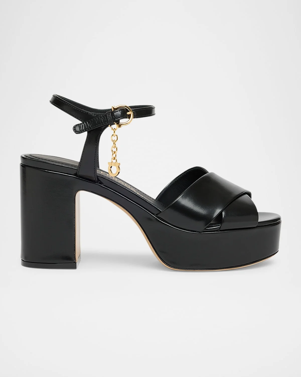 - Ferragamo "Savia" smooth leather platform sandals with a golden Gancini ankle charm accent - 3.25 in / 85 mm block heel - Open toe - Crisscross vamp - Adjustable ankle strap - Leather outsole - Lining: Leather - Professional cleaning recommended - Made in Italy