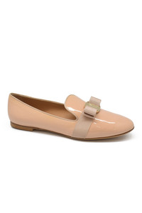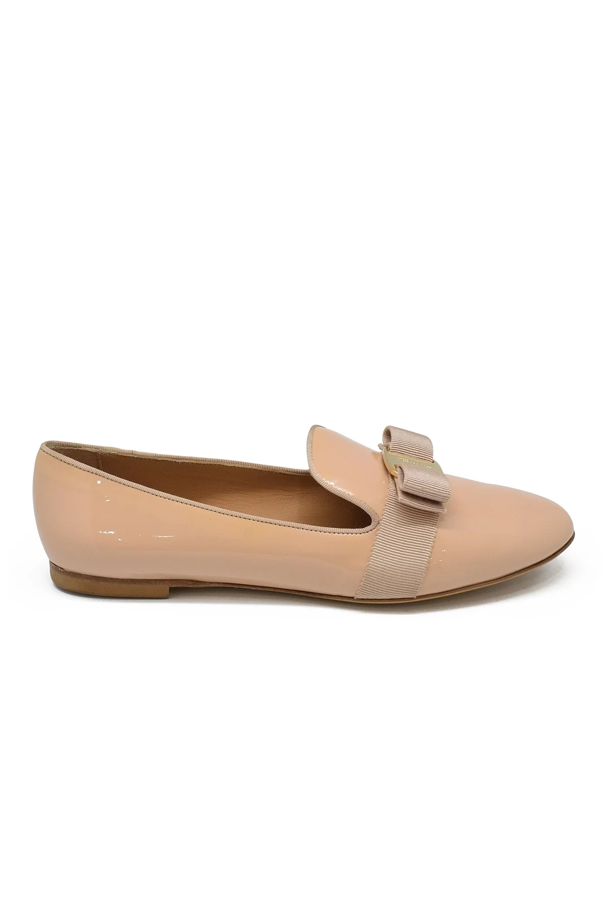 Salvatore Ferragamo loafers in beige varnished leather. Bow-tie on the front. Leather sole. Made in Italy.