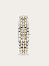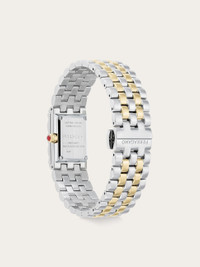 Ferragamo introduces Ferragamo Secret, a new iconic timepiece that intertwines elegance and mystery in an exclusive design by Creative Director Maximilian Davis. At first glance, this exquisite watch may appear as a luxurious and feminine bracelet, but a gentle pressure on the crown lifts the top cover, revealing a beautiful and radiant dial. Size: 18.5 x 30 mm Movement: RONDA 1032 - 2 hands quartz Case: Bico IP yellow gold secret watch with Ferragamo logo on cover. Red cabochon on crown Dial: White silver sunray dial with metal studs Bracelet: Bico IP yellow gold bracelet - Butterfly buckle with Ferragamo logo Glass: Sapphire crystal anti-reflection, scratch-resistant WaterResistance: 30 meters 2+2 Year Warranty Outer box, packaging, warranty and instruction booklet - Composition: Stainless steel and IP yellow gold case and bracelet - Made in SWISS - Product code: 611296 772580
