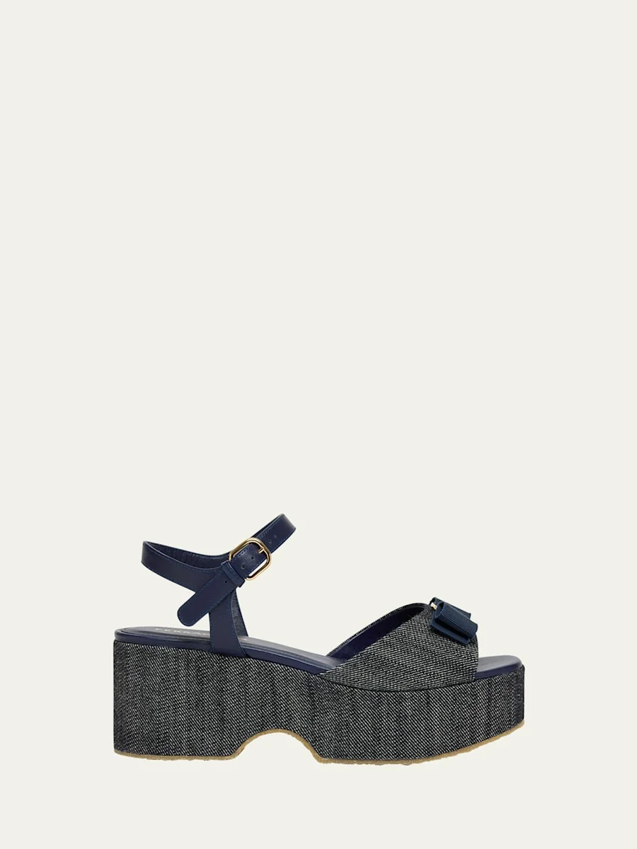 Ferragamo "Selna" denim cotton and leather platform sandals with a logo-engraved bow accent 2.75 in / 70 mm wedge heel Open toe Adjustable ankle strap Rubber outsole Lining: Leather Professional cleaning recommended Made in Italy Online Inquiries: BGS21_X6UTZ| Store Inquiries: #4981232