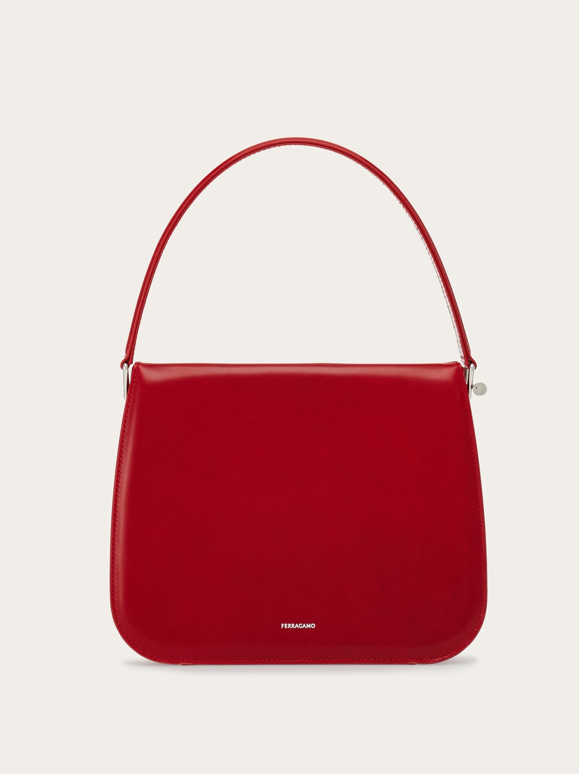 Lady-like allure and a retro vibe define this new handbag from Ferragamo. The semi-rigid structure features vegetable-tanned calfskin panels and accordion details with a semi-matte finish. Geometric and rounded on the base, it opens via a vintage-inspired side lever and snap lock mechanism. The palladium-finish metal frame on the interior reveals a lined interior complemented by four flat pockets. - height 7.0 IN length 8.8 IN width 3.5 IN - Composition: calfskin - Made in ITALY - Product code: 215485 766722